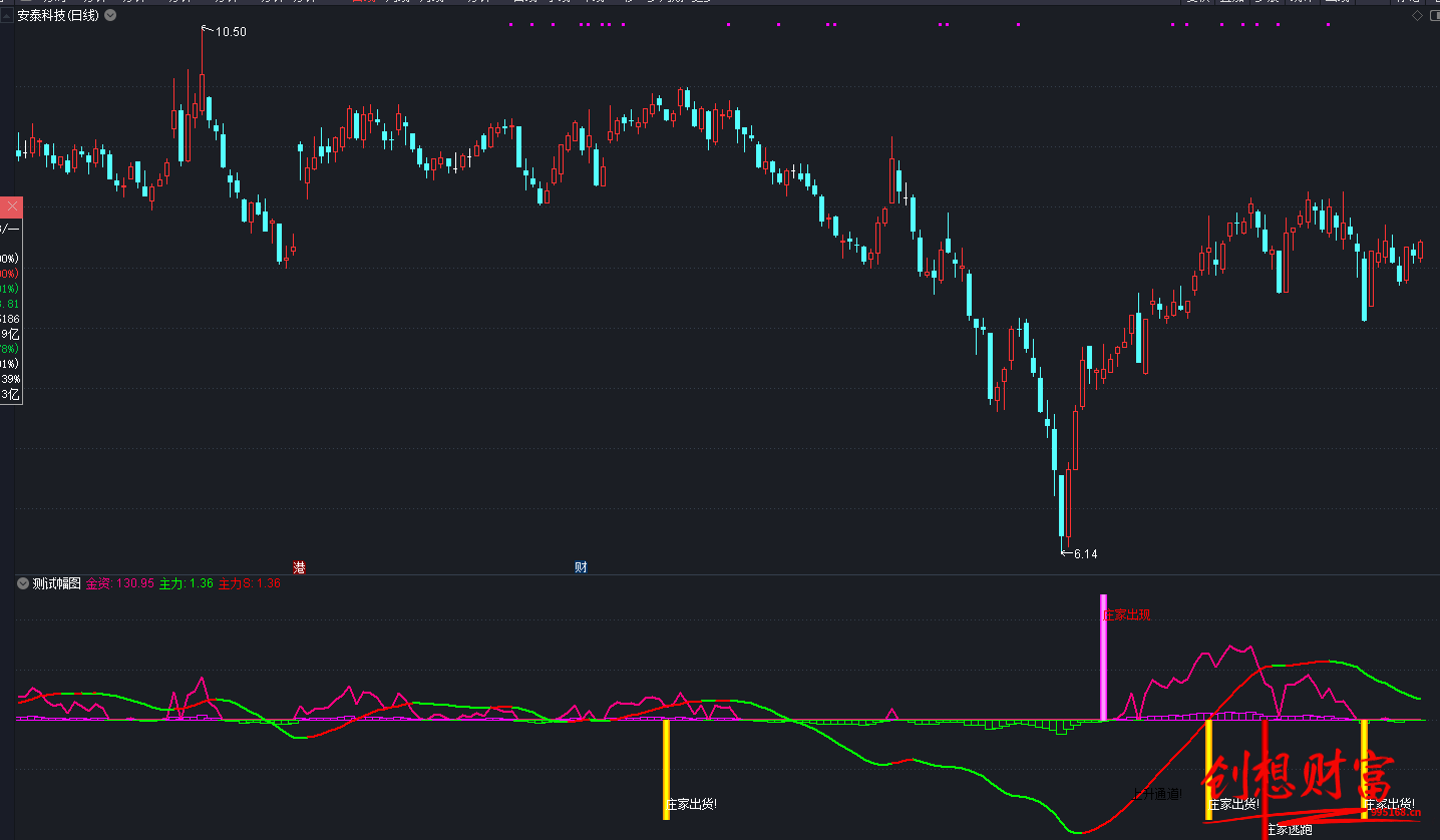量能:=(CLOSE-MA(CLOSE,30))/MA(CLOSE,20)*120; 金资:IF(量能>0,量能,0)*10,COLORLIMAGENTA,LINETHICK2; 行情:STICKLINE(量能>0,量能,0,5,1)*600000,COLORMAGENTA,LINETHICK2; 空仓:STICKLINE(量能<0,0,量能,5,1)*600000,COLORGREEN,LINETHICK2; 主力:EMA(EMA(量能,30),3)*20,COLORGREEN,LINETHICK2; 乖离:=(C-MA(C,5))/MA(C,5)*1000,COLORGREEN,LINETHICK2; 主力S:IF(主力>REF(主力,1),主力,DRAWNULL),COLORRED,LINETHICK2; Q2:=(CLOSE-LLV(LOW, 18))/(HHV(HIGH, 18)-LLV(LOW, 18))*100; Q3:=SMA(Q2, 9, 1); Q4:=SMA(Q3, 3, 1); 专用:=3*Q3-2*Q4; Q8:=HHVBARS(HIGH, 50); Q10:=(CLOSE-REF(OPEN, Q8))/REF(OPEN, Q8)*100; 顶:=STICKLINE(CROSS(专用, 8) AND Q10<-13, 0,340,10,0); 底顶:=FILTER(顶,50); 跨越:=EMA(Q3, 3); DRAWTEXT(FILTER(CROSS(跨越,专用) AND REF(专用,1)>80 AND 跨越>80,20), -220,'庄家逃跑'),COLORWHITE ,LINETHICK5; AA:=STICKLINE(CROSS(跨越,专用) AND REF(专用,1)>80 AND 跨越>80, 0,320,10,0); 底顶A:=FILTER(AA,20); STICKLINE(底顶A, 0,-250,3 ,0),COLOR000077; STICKLINE(底顶A, 0,-250,2.5,0),COLOR000099; STICKLINE(底顶A, 0,-250,1.9,0),COLOR0000BB; STICKLINE(底顶A, 0,-250,1.2,0),COLOR0000DD; STICKLINE(底顶A, 0,-250,0.4,0),COLOR0000FF; V3:=100-(100-3*SMA((C-LLV(L,55))/(HHV(H,55)-LLV(L,55)) *100,20,1)+2*SMA(SMA((C-LLV(L,55))/(HHV(H,55)-LLV(L,55)) *100,20,1),15,1)); V4:=100-(100-3*SMA((O-LLV(L,55))/(HHV(H,55)-LLV(L,55)) *100,20,1)+2*SMA(SMA((O-LLV(L,55))/(HHV(H,55)-LLV(L,55)) *100,20,1),15,1)); T7:=V3>REF(V4,1) AND V>REF(V,1) AND C>REF(C,1); 风:=STICKLINE(T7 AND COUNT(T7,30)=1,0,20,2,0); 风A:=STICKLINE(底顶 OR 风, 0,270,5,0) ; 风AA:=FILTER(风A,20); STICKLINE(风AA, 0,250,2.5,0),COLORFF11FF; STICKLINE(风AA, 0,250,2,0),COLORFF33FF; STICKLINE(风AA, 0,250,1.6,0),COLORFF55FF; STICKLINE(风AA, 0,250,0.9,0),COLORFF77FF; STICKLINE(风AA, 0,250,0.3,0),COLORFF99FF; DRAWTEXT(FILTER(风AA,20),210,'庄家出现'),COLORRED,LINETHICK5; V1:=MA(100*(C-LLV(C,34))/(HHV(H,34)-LLV(L,34)),5)-20; V2:=2*ABS(V1); V5:=(H+L+C)/3; V6:=(V5-MA(V5,10))/(0.015*AVEDEV(V5,10)); V7:=(V5-MA(V5,30))/(0.015*AVEDEV(V5,30)); V8:=IF(V6>=150 AND V6<200 AND V7>=150 AND V7<200,10,0); V9:=IF(V6<=-150 AND V6>-200 AND V7<=-150 AND V7>-200,-10,V8); VA:=(C-MA(C,13))/MA(C,13)*100; VB:=100-ABS(VA); VC:=3*SMA((INDEXC-LLV(INDEXL,55))/(HHV(INDEXH,55)-LLV(INDEXL,55))*100,20,1)-2 *SMA(SMA((INDEXC-LLV(INDEXL,55))/(HHV(INDEXH,55)-LLV(INDEXL,55))*100,20,1),15,1); 顶线:= IF(VB<90,VB,100); 多方:= IF(V1>0,V1,0); 空方