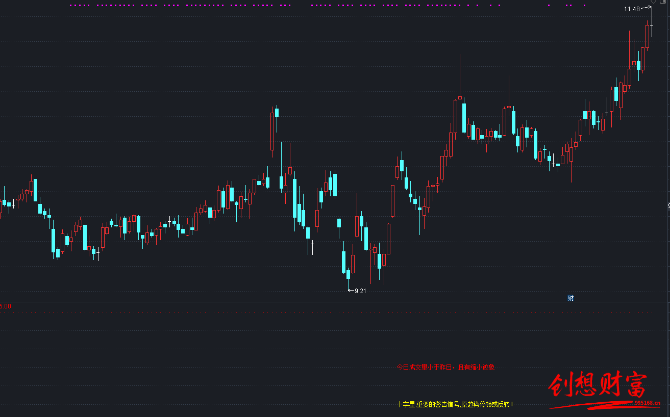DRAWTEXT(T3=1 AND CURRBARSCOUNT=58,AAA,'长十字,重要的警告信号,原趋势停顿或反转‖'),COLOR00FFFF ;